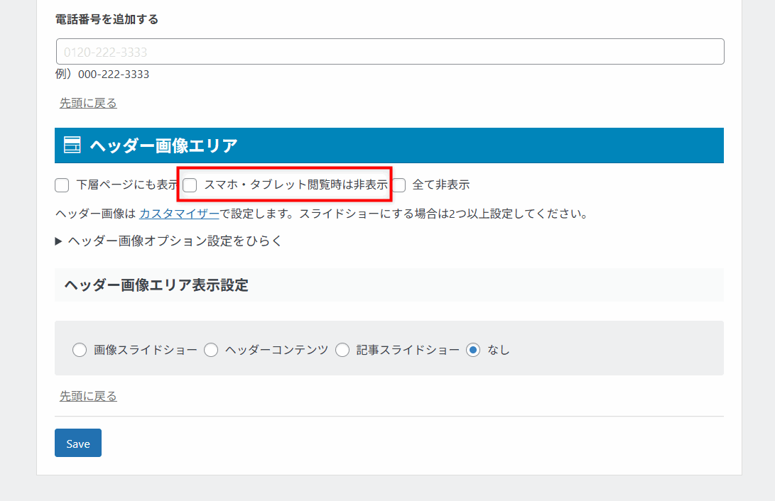 スマホでヘッダーが消える? → まず「スマホ・タブレット閲覧時は非表示」のチェックを確認。