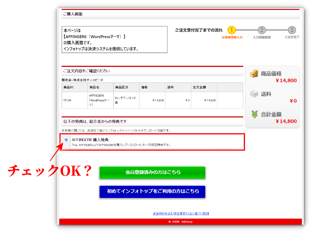 購入前に、必ず「AFFINGER6 購入特典」にチェックが入っているかをご確認ください。
