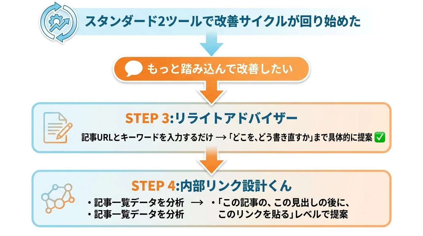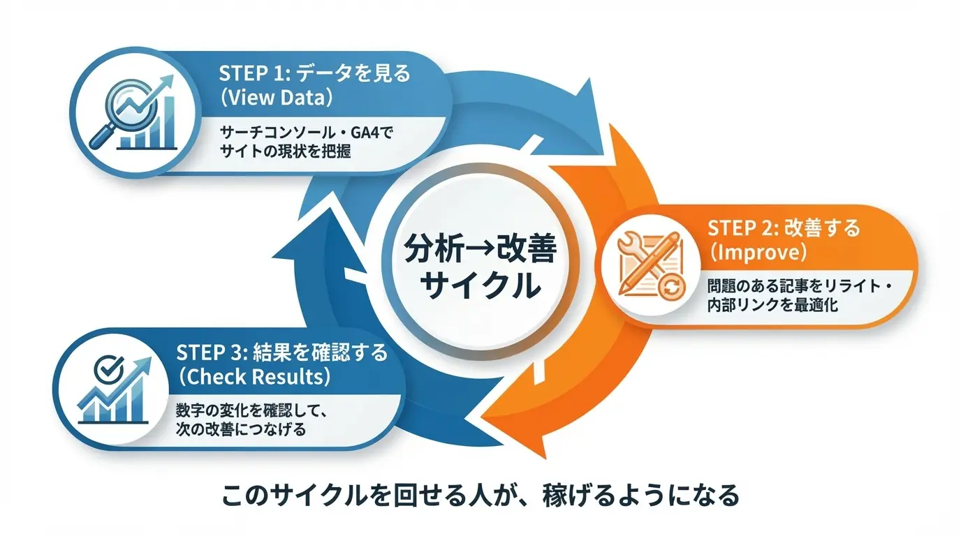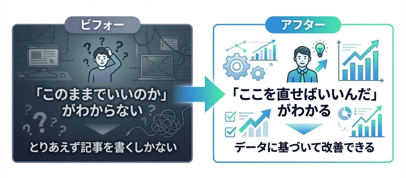 「記事を書いても手応えがない…」「次に何をすればいいかわからない…」という悩みを、データに基づいて解決する仕組みです。