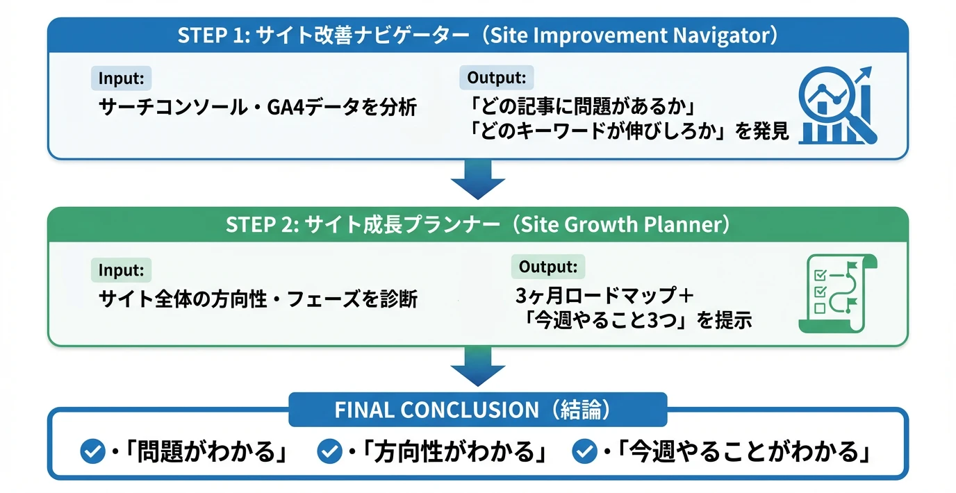 「記事を書いても手応えがない…」「次に何をすればいいかわからない…」という悩みを、データに基づいて解決する仕組みです。