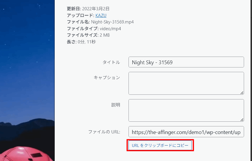 アップロードしたファイルをクリックし、ファイルのURLをコピーする