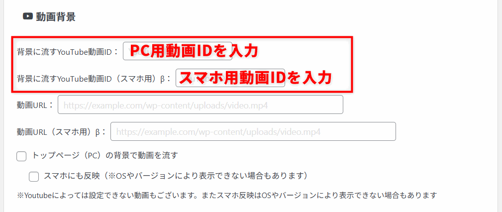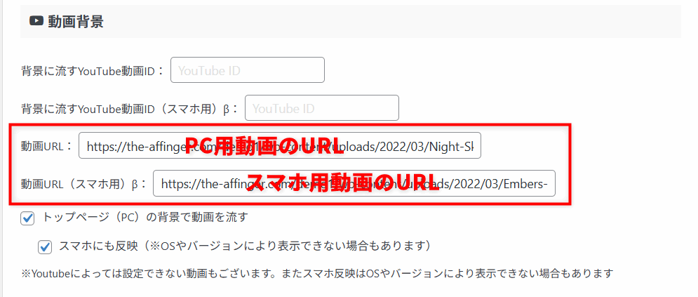 - AFFINGER管理 > トップページ > 動画背景 で、 PC用欄→PC用ファイルのURL、スマホ用欄=スマホ用ファイルのURLを入力