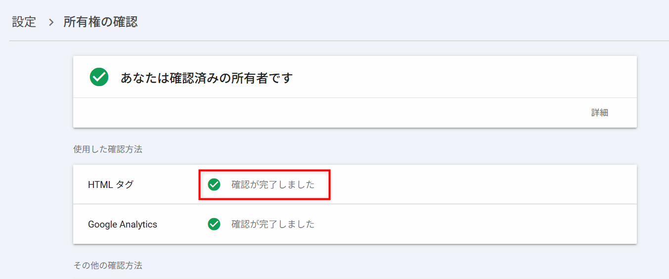 サーチコンソールの管理画面 →「設定」→「所有権の確認」で、HTMLタグの横に「確認が完了しました」と表示されていればOKです。